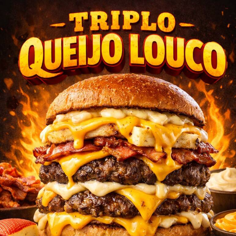 Pão bola, carne de hambúrguer, ovo, bacon, queijo mussarela, queijo cheddar, tomate, alface e molho especial.