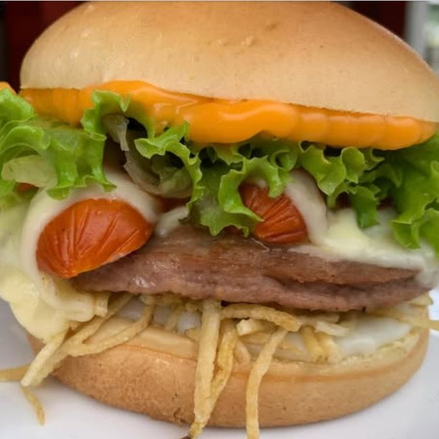 Pão bola, hamburguer, queijo cheddar, molho especial e tomate.