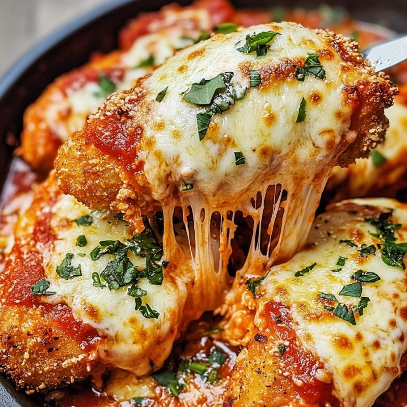 Suculento bife à parmegiana com molho de tomate fresco e queijo mussarela derretido, acompanhado de feijão e arroz .