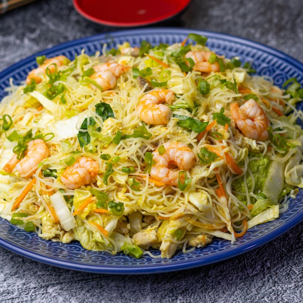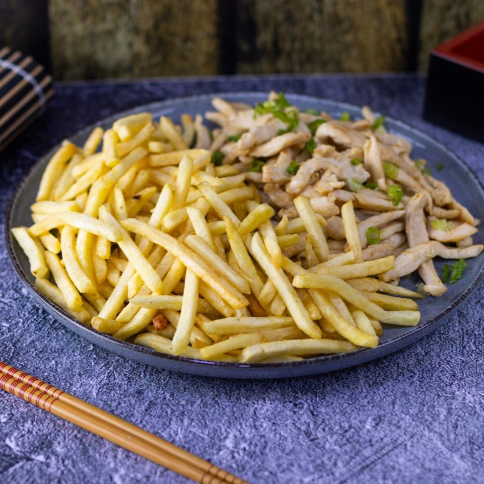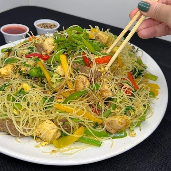 Uma porção generosa de bifum salteado com legumes frescos com deliciosos cortes de frango, carne e camarão envolto em um molho especial cheio de sabor. Acompanha porção de fritas.