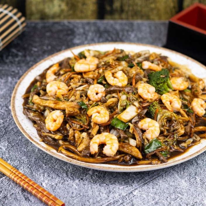 Carne bovina, frango grelhado e camarões selecionados, combinados com macarrão oriental, legumes frescos salteados e molho especial.