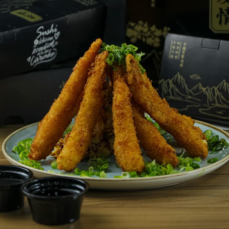 10 Unidades de tempurá de camarão empanado na farinha panko acompanha molho shoyu especial.