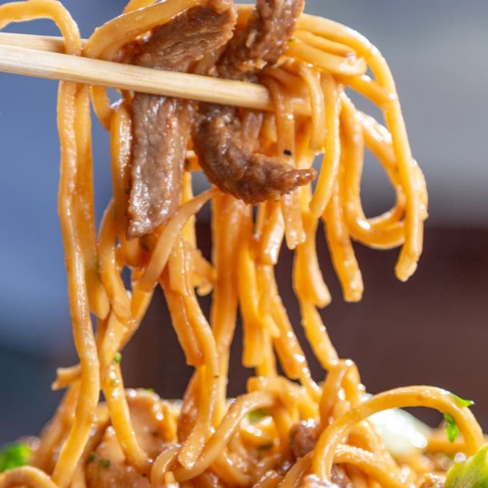Macarrão oriental, legumes, carne Bovina, frango e molho da casa.