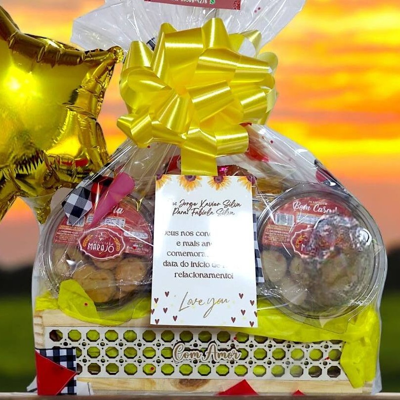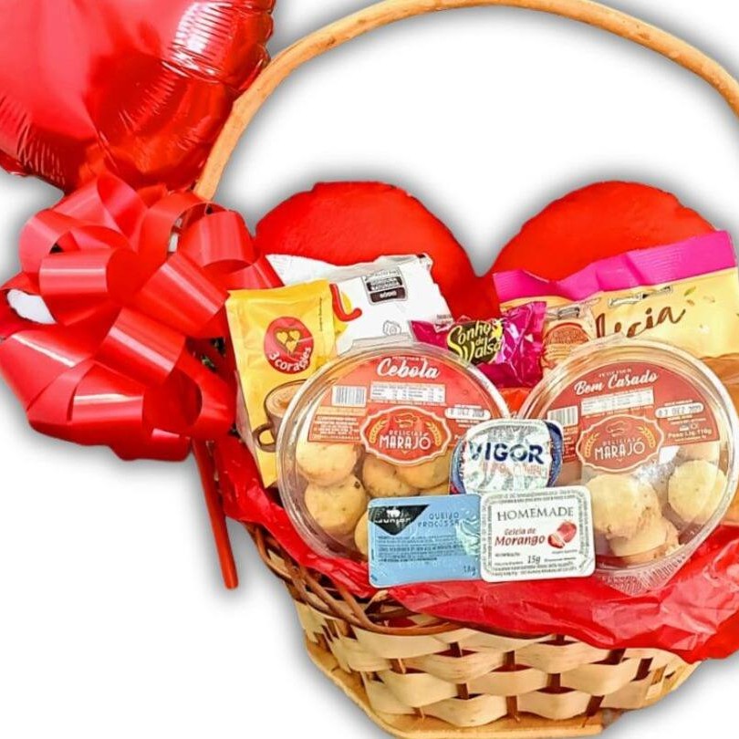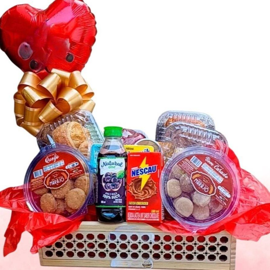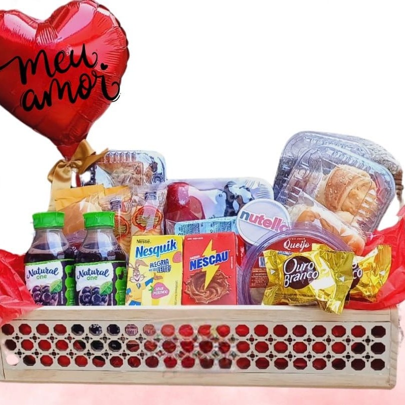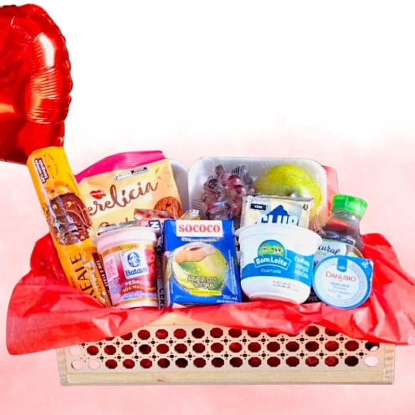 1 Torradas Bauducco tradicional 15g 1 Cookies integral frutas vermelhas Cerelicia 100g Petit four Amanteigado 110g Petit four Bem casado 110g 1 Biscoito Salgado Pit Stop 100g Pão Bisnaguinha 1 Nescau prontinho 1 cappuccino 3 corações 20g 1 Queijo processado Junior 18g 1 Manteiga Vigor 10g 1 Geléia Junior 15g 1 Bolo de Rolo 60g 1 Bombom de Chocolate 20g 1 Pelúcia de coração ou emotico 1 Caixote M Cartão de mensagem Decoração especifica com a ocasião. ( Não acompanha balão) Acompanha cartão de mensagem, envie nos comentários: De: Para: Uma mensagem: Preferencia de cor do Laço.