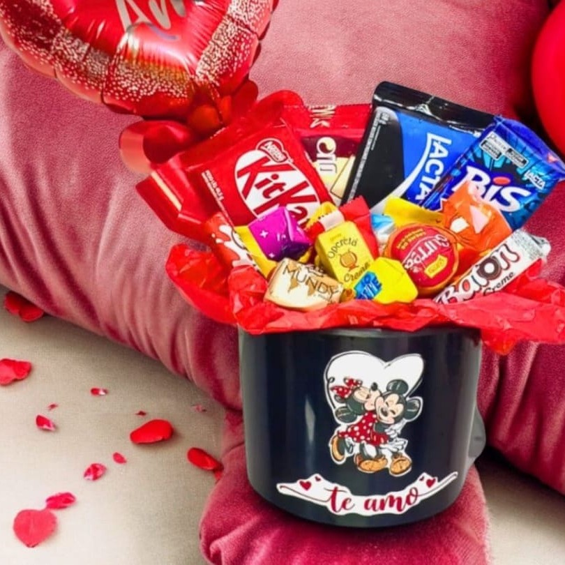 Salgadinho cheetos Nescal prontinho Jujuba Fini Mentos M&M Chocolate Marshmallow Balão Baldinho decorado Laço e Cartão personalizado De: Para: uma mensagem : Qual tema preferido
