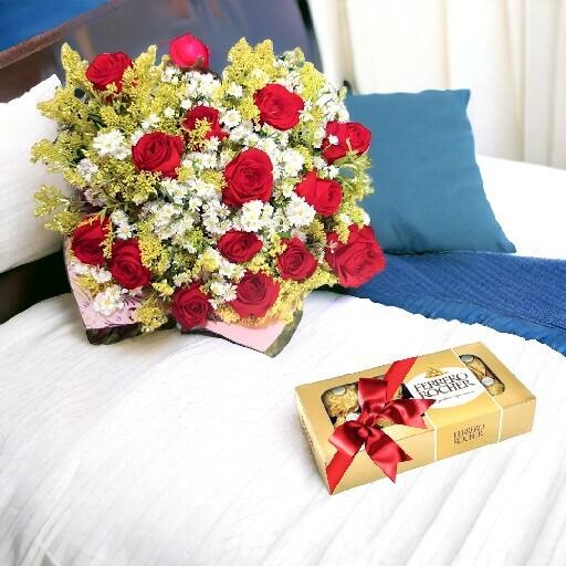 Encante-se com o nosso 'Buquê de 10 Rosas + Ferrero Rocher (8 und)', uma oferta especial da categoria 'Promoção do Dia'. Este mimo é composto por um deslumbrante buquê com 10 rosas vermelhas naturais, exalando beleza e frescor. Acompanha ainda uma caixa com 8 deliciosas unidades do renomado chocolate Ferrero Rocher, envolto em um delicado papel dourado, que promete derreter na boca. Para adicionar um toque pessoal, incluímos um cartão de dedicatória. Por favor, nos forneça os detalhes de 'De', 'Para' e a 'Mensagem' desejada. Uma oferta perfeita para surpreender quem você ama!