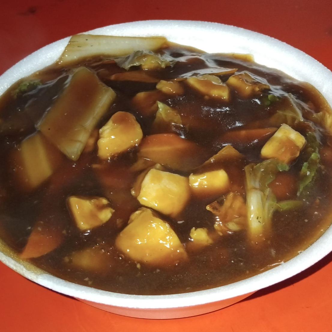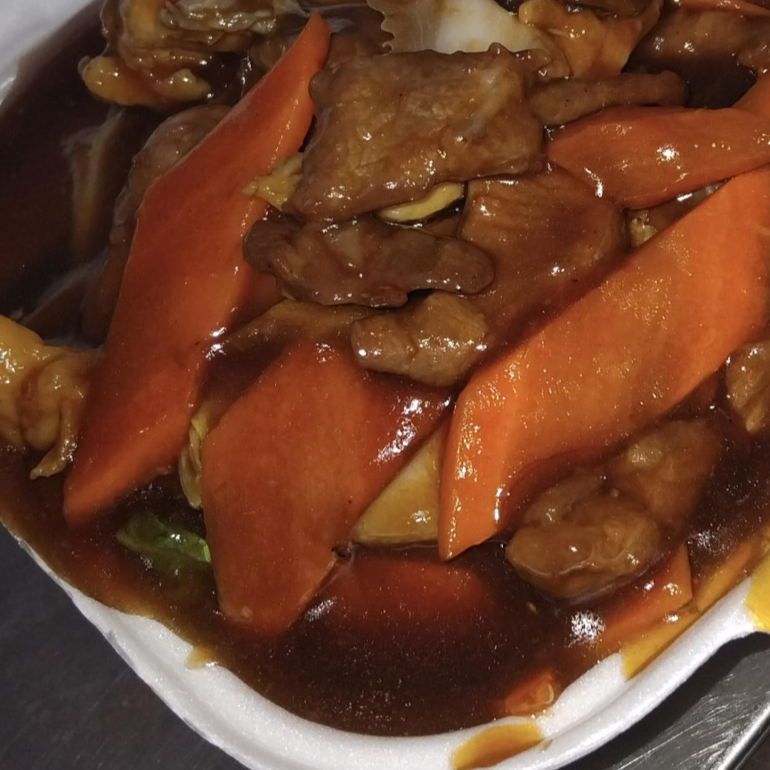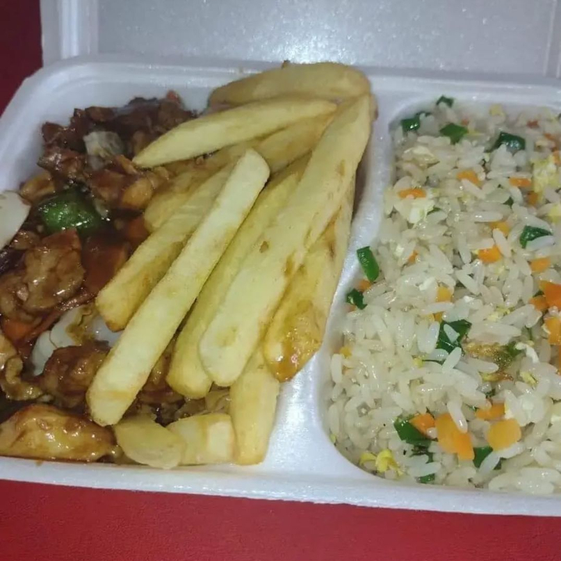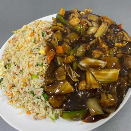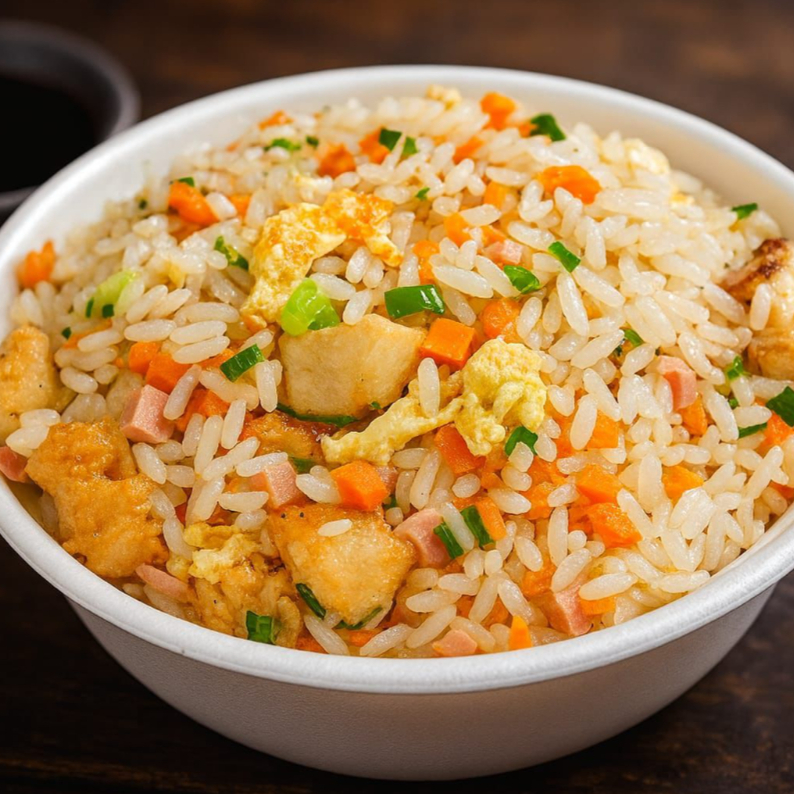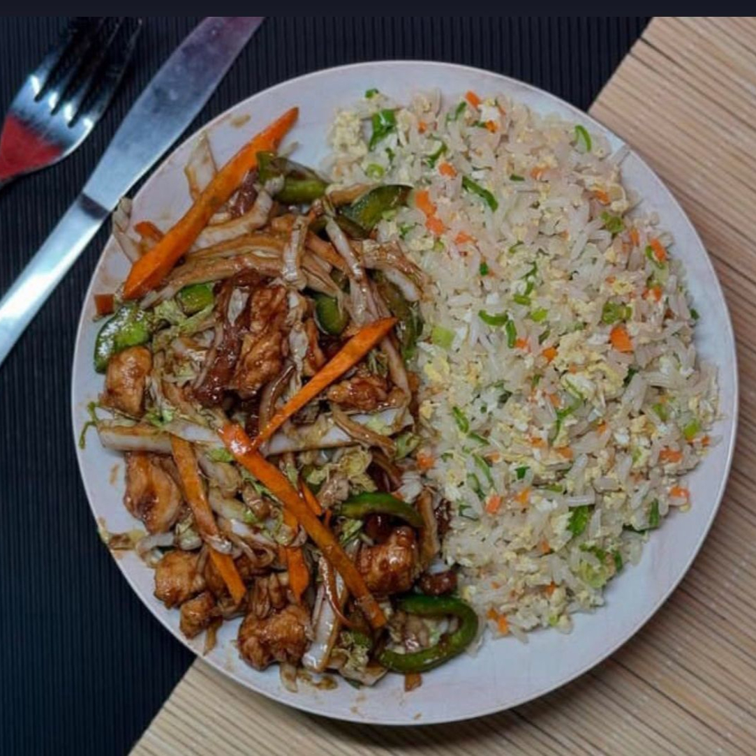 (FRANGO EM CUBOS,ARROZ,CENOURA,CEBOLA E PIMENTÃO AO MOLHO SHOYO)