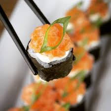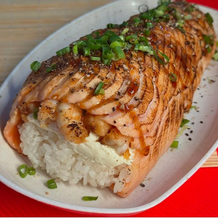 ARROZ COM O RECHEIO DE KANI CAMARAO CREME CHESSE E CEBOLINHA E LAMINA DE SALMAO EM CIMA
