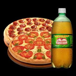 Delicie-se com a nossa imperdível promoção: duas pizzas grandes de sua preferência, combinadas com um refrescante refrigerante de 1 litros. Os sabores disponíveis são: a clássica Mussarela, a picante Calabresa, a tradicional Marguerita, a rústica Napolitana, a suculenta de Presunto, a saborosa de Bacon, a irresistível de Frango, a especial de Lombo, a quatro queijos, a exótica Calabria, a inusitada Calacheddar, a doce Romeu e Julieta e a surpreendente de Doce de Leite. Informe os sabores escolhidos na caixa de observação ao realizar seu pedido. Aguardamos ansiosos para satisfazer o seu paladar!