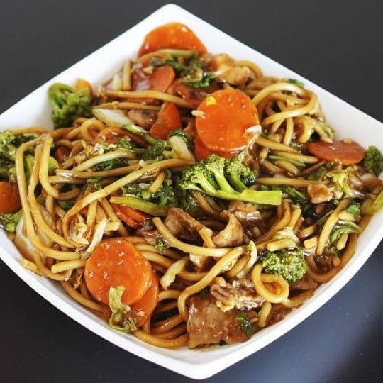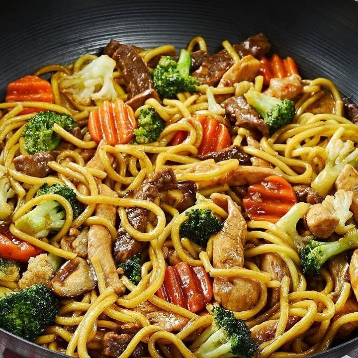 Delicioso Yakissoba Misto, uma joia da Culinária Chinesa. Este prato reúne macarrão banhado em um autêntico molho oriental, com cubos suculentos de frango, tirinhas tenras de carne e filés de camarão frescos e saborosos. Acrescenta-se a essa mistura, acelga crocante, repolho fresco e cenouras vibrantes, aliados ao brócolis nutritivo, cebolas aromáticas e pimentões coloridos. Uma experiência culinária que mistura texturas e sabores para proporcionar uma refeição incrivelmente saborosa e satisfatória.