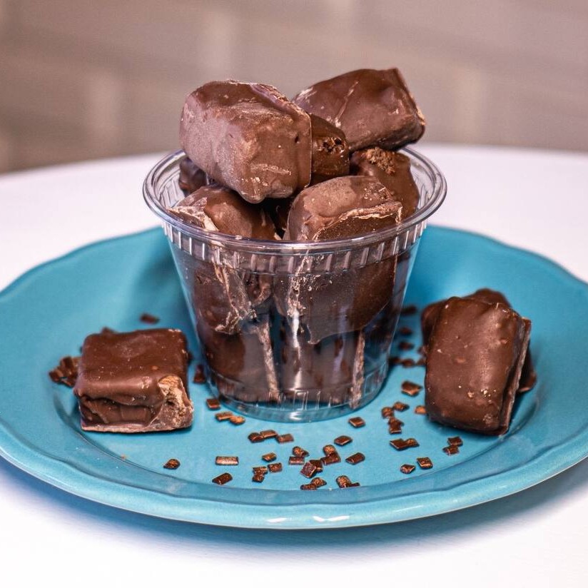 Brownies padrão Mb banhadas no chocolate nobre ao leite.