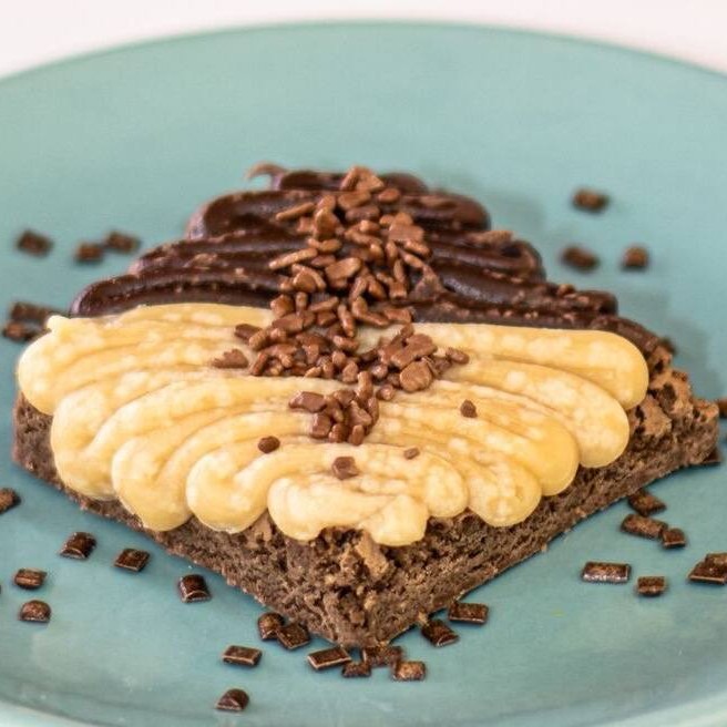 O famoso Brownie Padrão Mb, com a casquinha crocante por fora e úmido por dentro, finalizado metade com brigadeiro branco e a outra metade com brigadeiro preto 50% cacau.