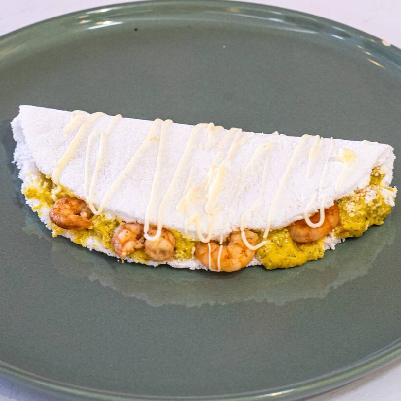 Deliciosa tapioca, feita na hora, com recheio de camarão , finalizada com queijo mussarela.