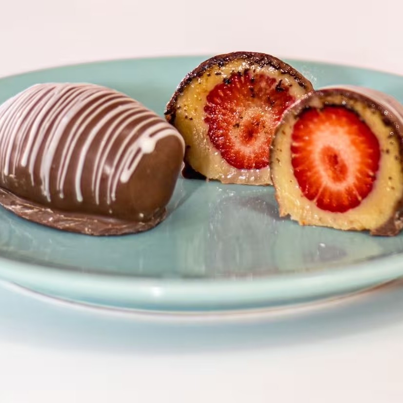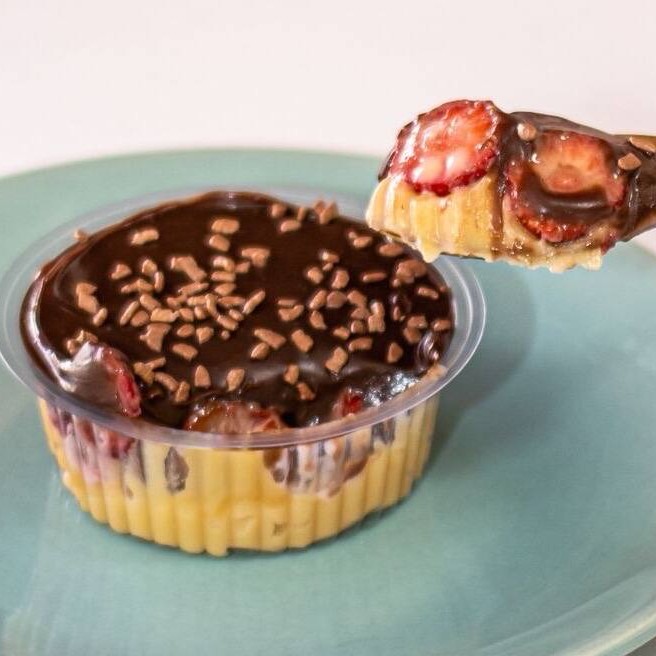 Um Morango fresco, enrolado no brigadeiro de leite Ninho, banhado no chocolate nobre ao leite. Campeão de vendas da categoria. Na foto são duas unidades apenas para mostrar o produto cortado e como ele vai servido.