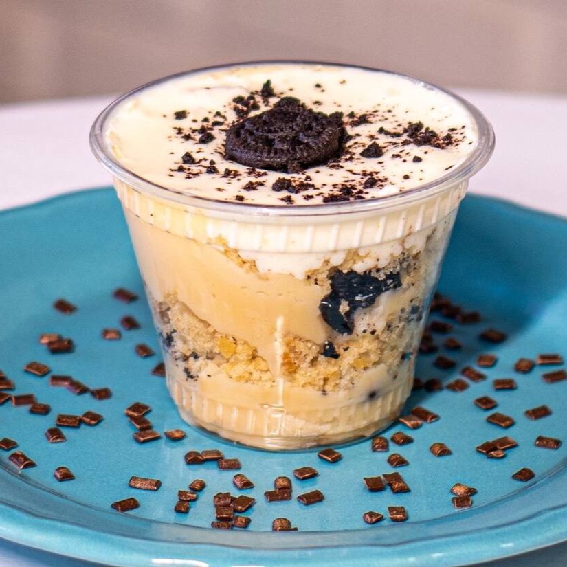 Recheio de leite Ninho, com pedaços do biscoito Oreo, com pedaços de bolo branco, finalizado com um mousse de leite Ninho.