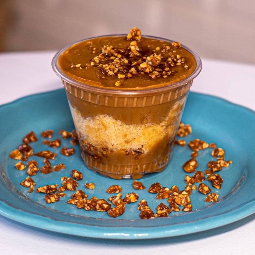 Recheio de doce de leite artesanal da Maria Boleria com pedaços da massa amanteigada sabor baunilha, finalizada com crocante de amendoim.