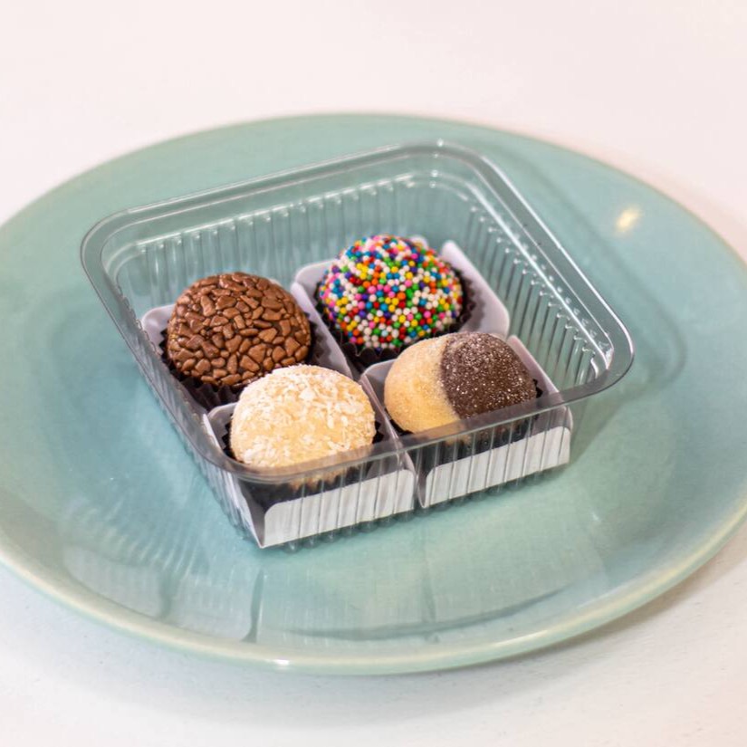Caixinha 4 doces. 1 brigadeiro, 1 bem casado, 1 brigadeiro colorido, 1 beijinho. Todos com 18g cada. Obs: não fazemos trocas de itens.