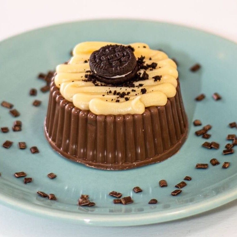 Casquinha crocante de chocolate ao leite, recheada com brigadeiro de leite Ninho e pedaços do biscoito Oreo