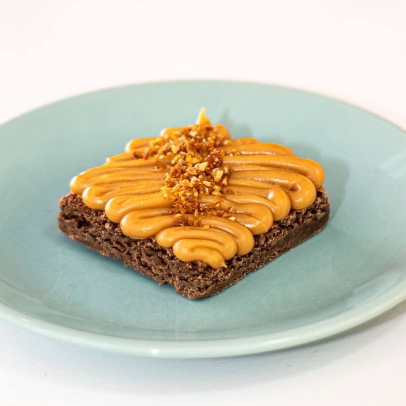 O famoso Brownie Padrão Mb, com a casquinha crocante por fora e úmido por dentro, finalizado com recheio de doce de leite 100% artesanal da Maria Boleria e crocante de amendoim