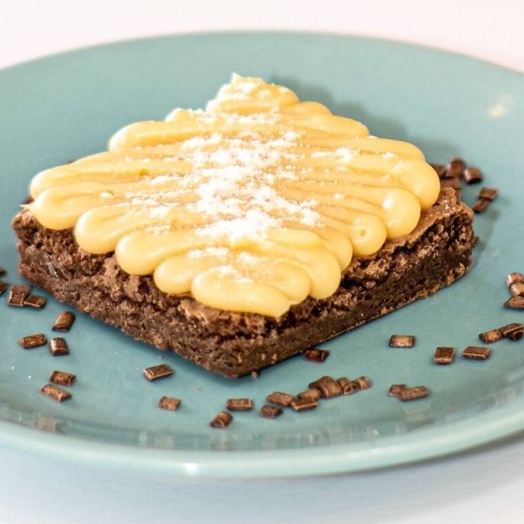 O famoso Brownie Padrão Mb, com a casquinha crocante por fora e úmido por dentro, finalizado com recheio de leite Ninho