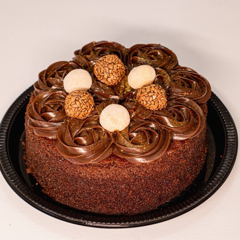Deliciosa massa de chocolate, fofinha e molhadinha, com recheio vulcão de chocolate 50%, decorado com decoração rosetas de chocolate, finalizado com 6 brigadeiros em cima. Perfeito para quem não quer festão e vai fazer “só um bolinho”.