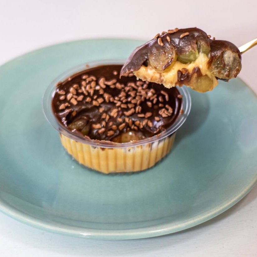 Uma camada de brigadeiro branco, com uvas verdes, sem caroço, finalizado com uma camada de brigadeiro 50% e granulados.