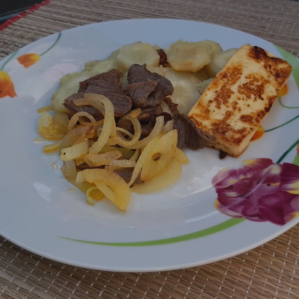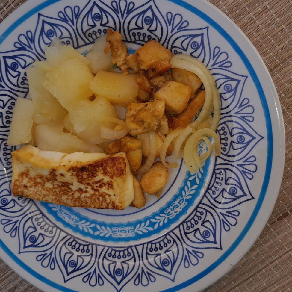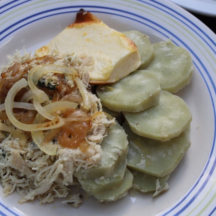 Macaxeira Com Frango Acebolado, Queijo Coalho E Manteiga De Garrafa