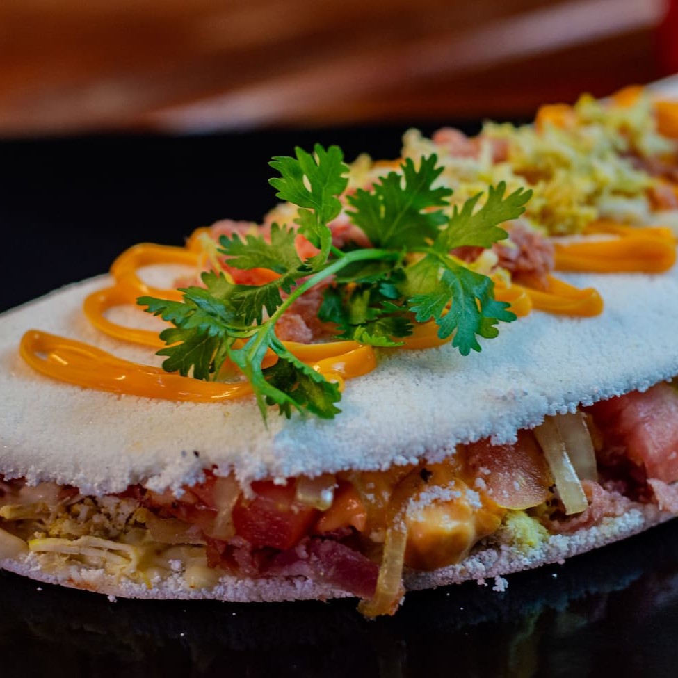 A refeição completa para vocês: Delicioso Cuscuz Fofinho recheado com 3 sabores tipo peitinho. Charque (carne seca), carne de sol, frango desfiado, calabresa, bacon, queijo coalho, Catupiry, cheddar, ovos, acompanhado de carne de sol, calabresa ou frango queijo coalho e coberto com um creme de cheddar e vinagret; Escolha até 3 sabores. Serve duas Pessoas