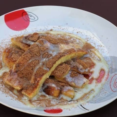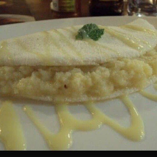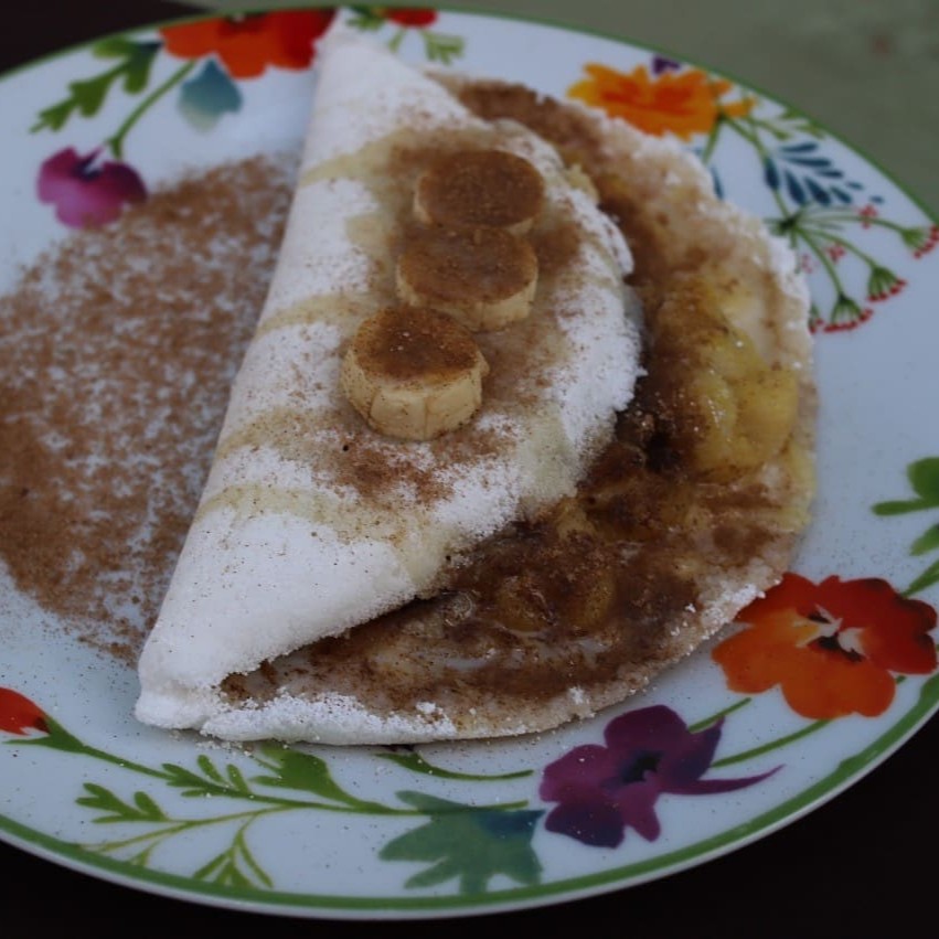 Deliciosa Tapioca dobrada tamanho Grande Recheada com Suculentas Bananas Pratas assadas na manteiga de garrafa e Queijo Coalho Ralado Coberta com Açucar e Canela Supreme Regada com Leite Moça. Peso Aprox 380g almoço, marmita, bom e barato, promoções, executivo