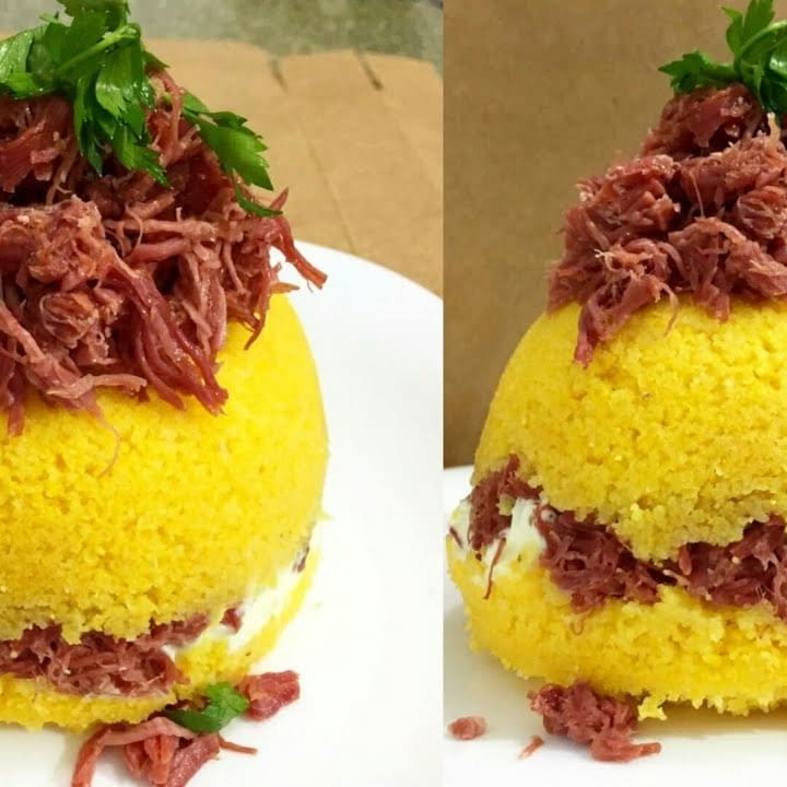 Maravilhoso cuscuz recheado com queijo coalho, goiabada e Leite Moça; Ideal para uma refeição apetitosa.