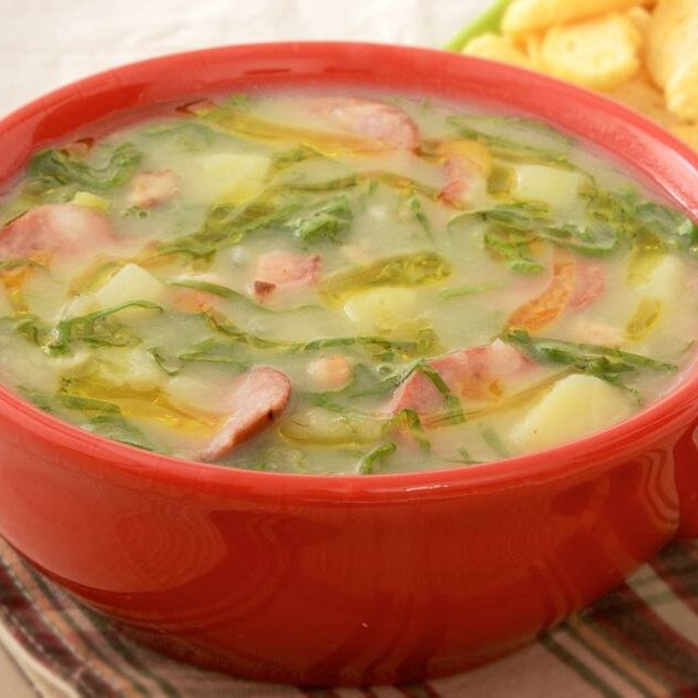 Delicioso Caldo de Macaxeira Refolgado com Cebola, Coentro e Couve Folha junto com Cortes Finos de uma Suculenta Calabresa Defumada. Peso: 500ml. Almoço barato, almoço até R$23