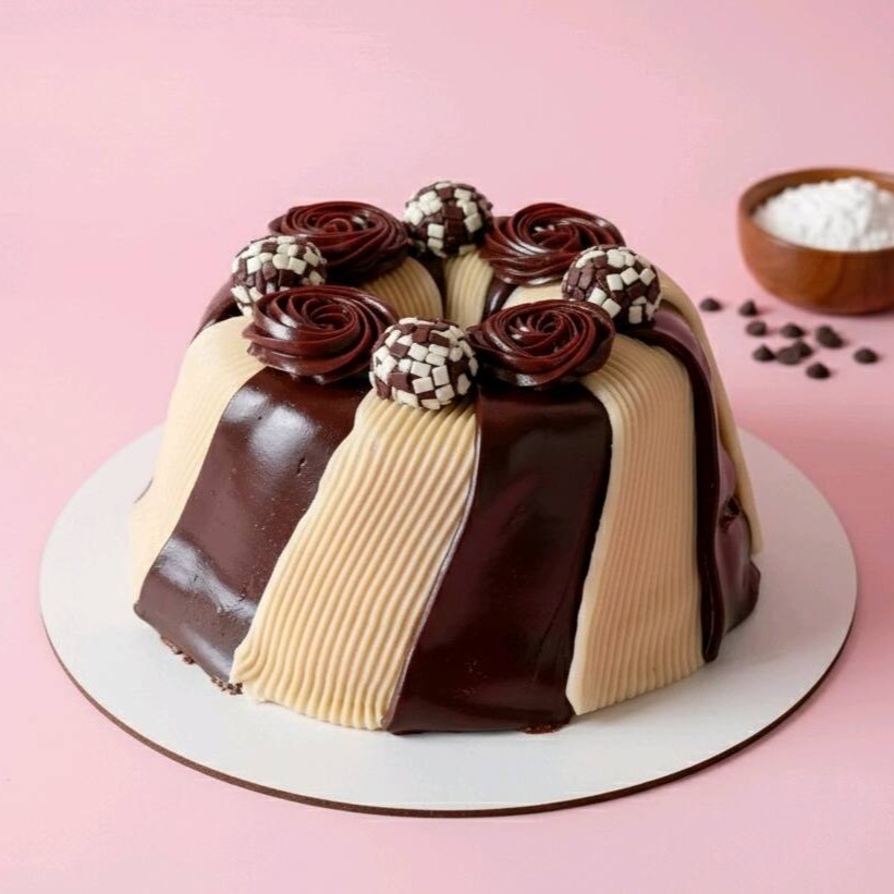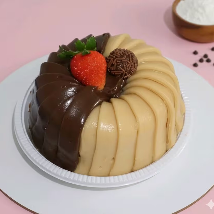 Peso 1.200kg. Bolo em forma de furo. Sugestão de 13 fatias de sobremesa. Massa Mesclada ou chocolate (Há sua escolha) Coberto com metade brigadeiro preto e metade brigadeiro branco decorado com bico e finalizado com raspas de Chocolate.