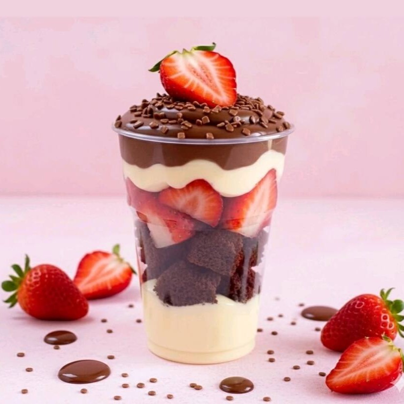 Copo de 200ml. Composto do nosso mouse de Ninho, Brownie, morangos, creme de Ninho e creme de brigadeiro 50% cacau.