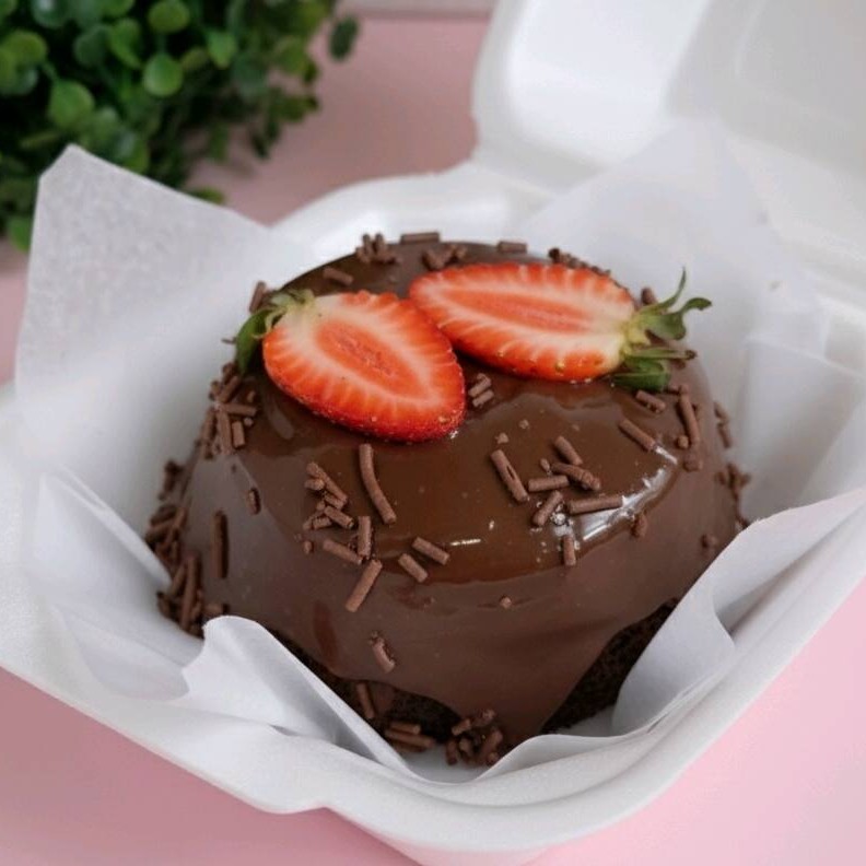 Feito em forma de 9cm. Massa de chocolate, coberto com um creme de brigadeiro e finalizado com Morango fresco.