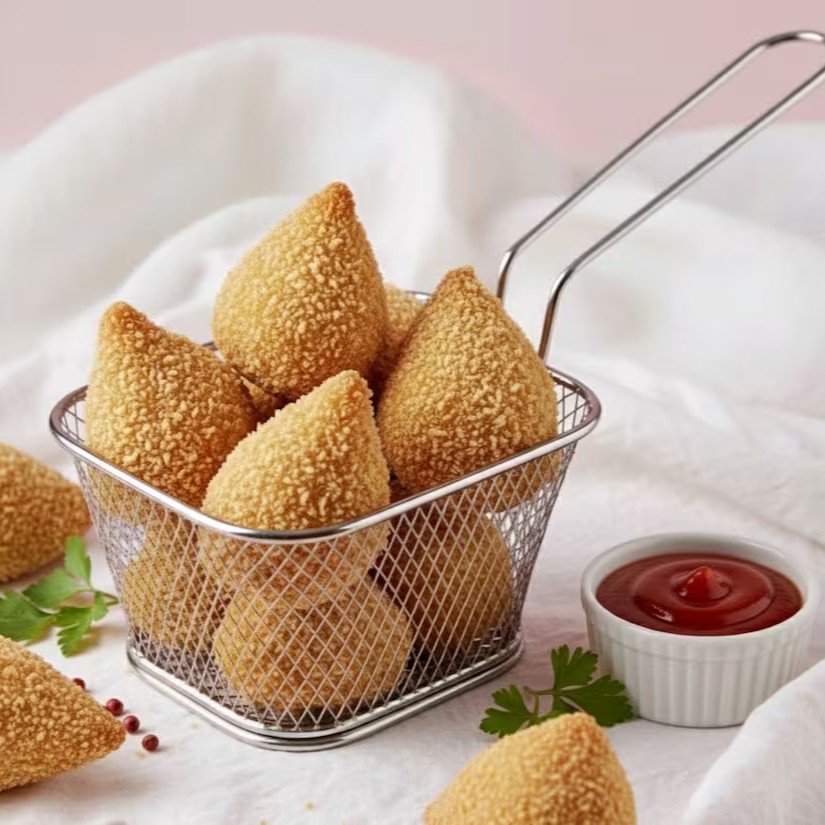 Porção com 25und. Massa super macia a base de leite e batata. Empanadas na farinha Panko. Peso médio 23g cada salgado.