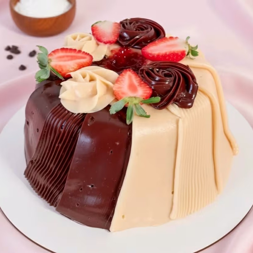 Peso 650gr. Bolo em forma de Furo de 14cm. Sugestão de 4 -5 fatias de sobremesa, Massa Neutra ou chocolate (Há sua escolha). Coberto com metade brigadeiro branco e metade brigadeiro preto. Finalizado com brigadeiro e morango.