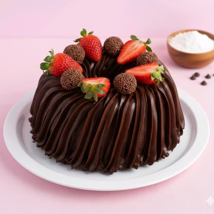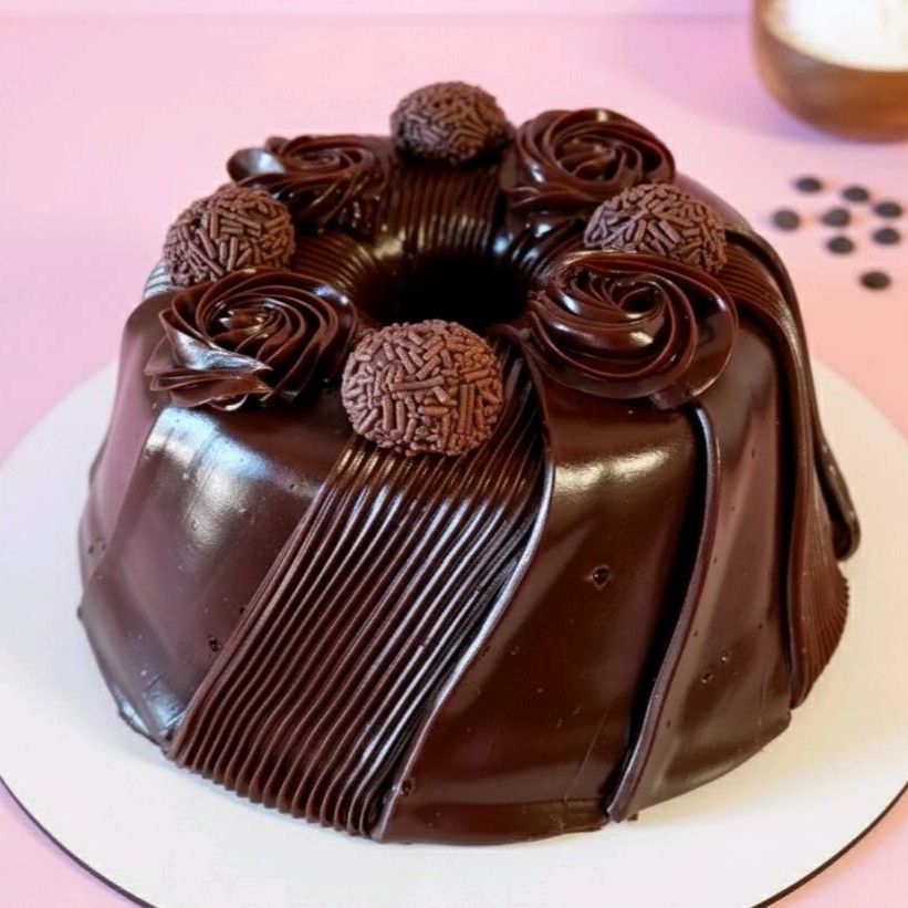 Peso 1.200kg.Feito em forma de furo, em aro 18cm. Sugestão de 13 fatias de sobremesa. Massa mesclada ou Chocolate (Há sua escolha). Coberto com brigadeiro gourmet cremoso e finalizado com raspas de chocolate.