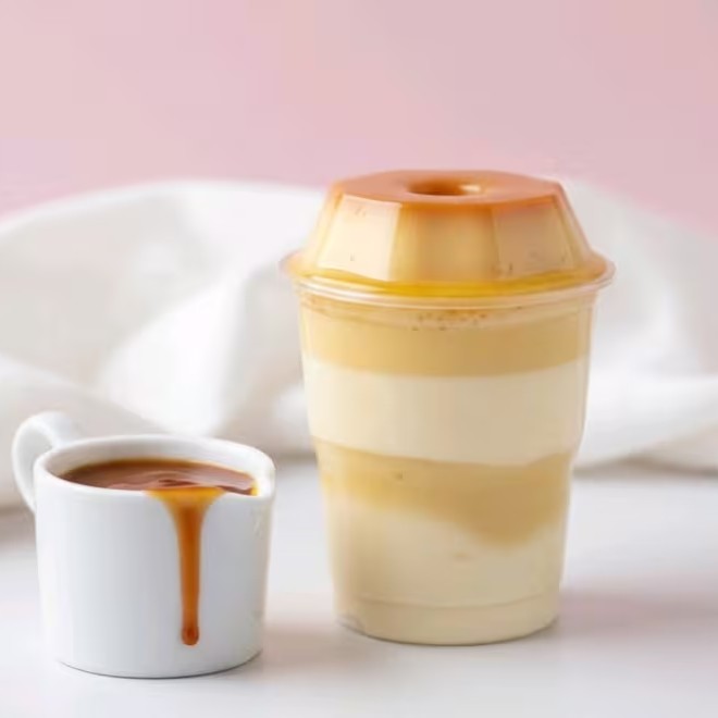 Copo de 200ml. Feito com creme de Ninho, mouse de Ninho e finalizado com pudim.