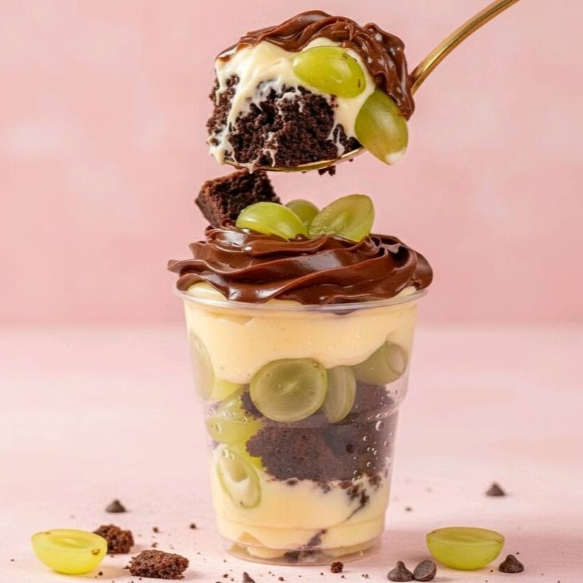 Copo de 200ml. Composto do nosso mouse de Ninho, Brownie, uvas sem caroço, creme de Ninho e creme de brigadeiro 50% cacau.