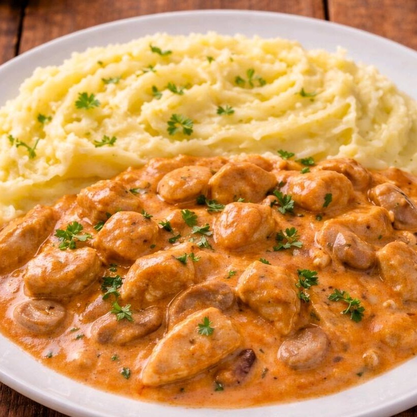Strogonoff de frango cremoso, servido com arroz branco fresquinho.