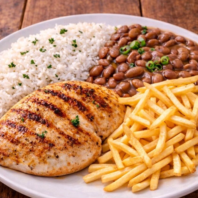 Nesta opção já vai com Arroz e feijão e você escolhe uma (1) mistura e (1) acompanhamento para o seu prato do Dia.