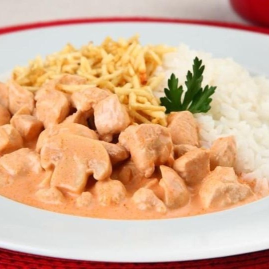 Experimente nosso irresistível estrogonofe de frango cremoso, servido com arroz branco soltinho e crocante batata palha. Uma combinação que vai conquistar o seu paladar!