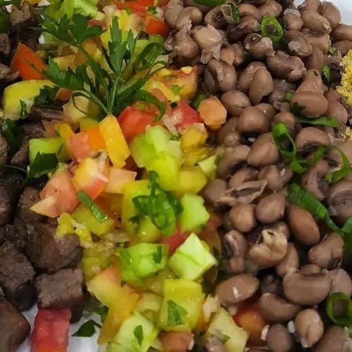 Leva feijão macassar kicaldo temperado com sazon picanha, leva charque acebolada, vinagrete, farofa. ( aprox 500g )