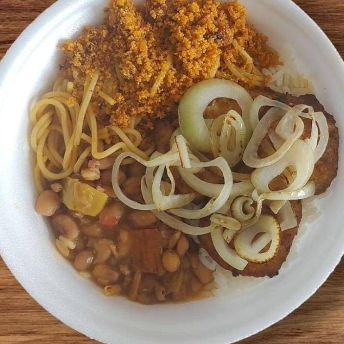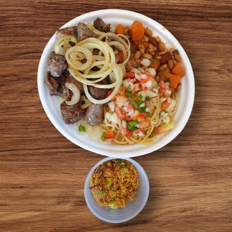 Bife acebolado, Arroz, Feijão, Macarrão, Farofa e Vinagrete