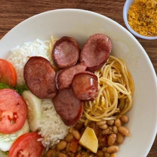 Vai feijão, arroz, macarrão, farofa, vinagrete,