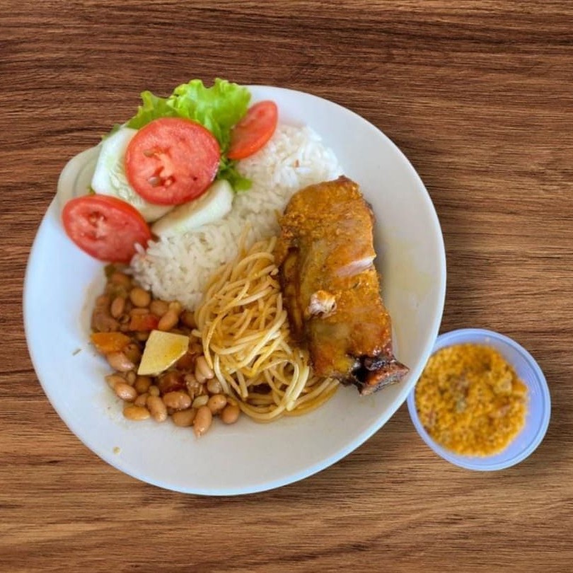 Sobrecoxa de Frango Ao Forno, Arroz, Feijão mulato, Macarrão, Farofa e Vinagrete