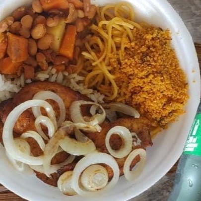 Uma delicioa marmita de 3 filezinho frito e acebolado para quem ama comer bem e pagar pouco. Vai feijão, arroz, macarrão, farofa, vinagrete.