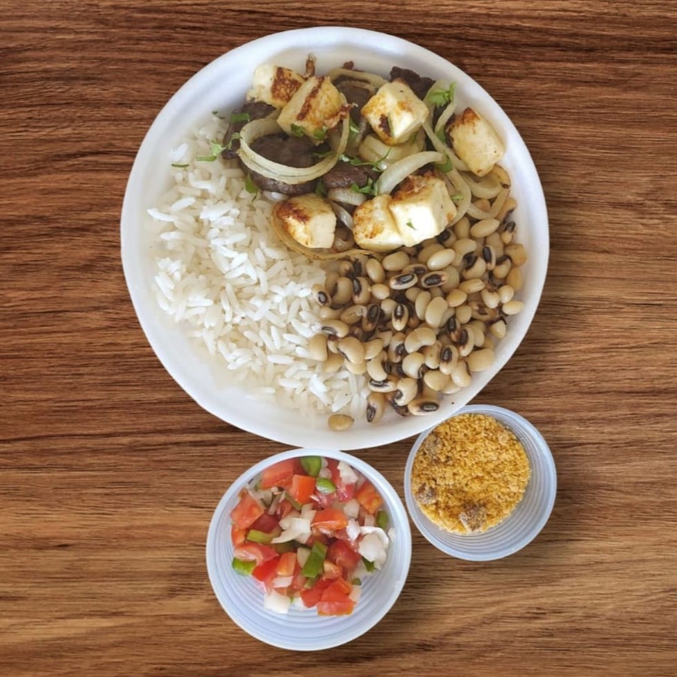Carne de sol em tiras ou em cubos acebolado, feijão macassar temperado com sazon picanha, vai arroz, vinagrete, farofa. E queijo em cubos.