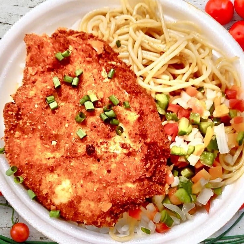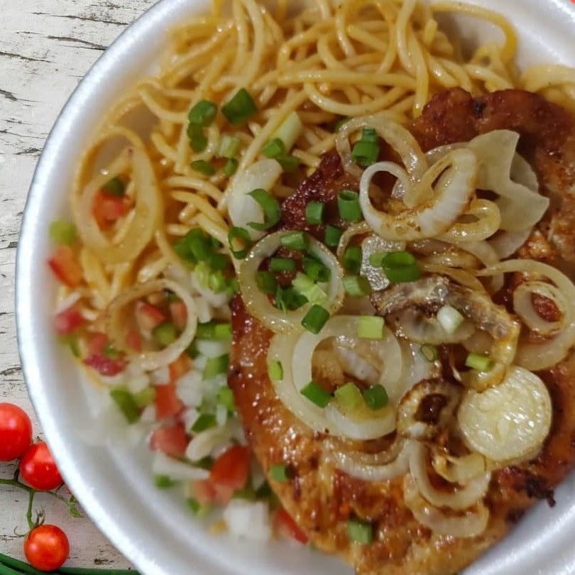 Um delicioso File de Frango Frito Acebolado, vai arroz, feijão mulado, macarrão, vinagrete e farofa. ( Marmita 400g )
