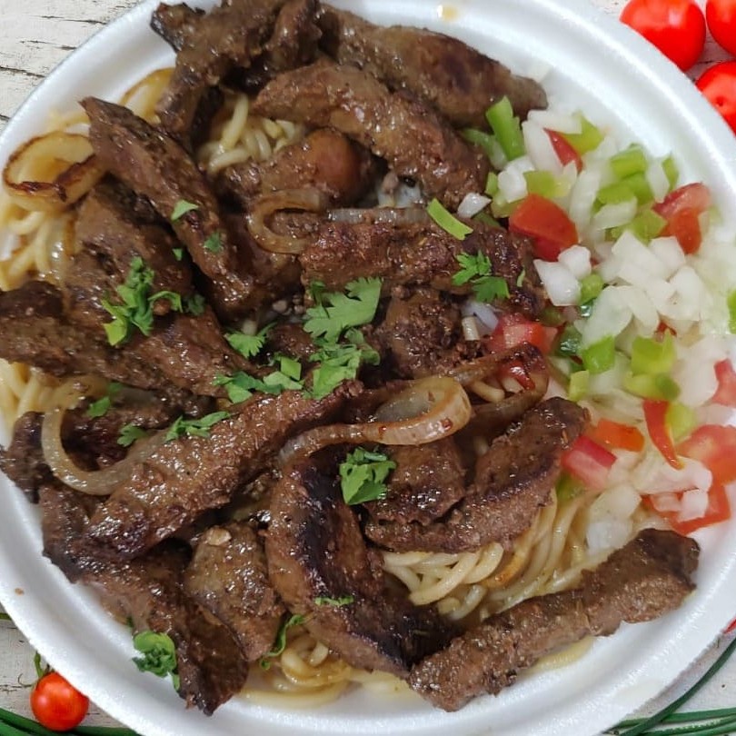 Figado Acebolado, vai Arroz, Feijão, Macarrão, Farofa e Vinagrete
